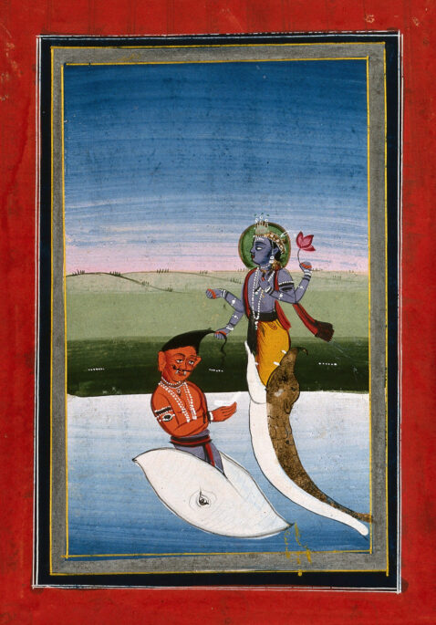 Vishnu in his fish avatar, Matsya, vanquishing the demon Hayagriva . Gouache drawing. Date unknown.