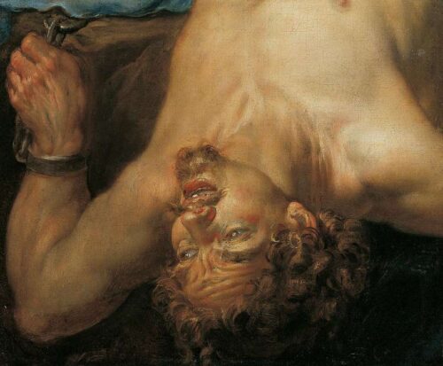 “Scholars disagree about whether Aeschylus wrote Prometheus Bound. Compared with his Oresteia, the grand civilizational trilogy that ends with the founding of law and the social contract, Prometheus is wild and archaic. The play begins with the smith-god Hephaestus chaining Prometheus to Mount Caucasus as punishment for excessive philanthropy. Hephaestus executes the task begrudgingly—he feels sympathy for Prometheus—but fear of Zeus, the usurper and terrorizing despot, compels him to carry on. Overseeing his work are Kratos and Bia, the personifications of force and violence, respectively. Kratos goads Hephaestus, threatens him, mocks him for his pity. All the while, Bia remains silent. The only words spoken in this initial scene are between Hephaestus and Kratos. The two-person dialogue is Aeschylus’s invention. In previous plays, characters had spoken only with the chorus; not until later, in Sophocles’ work, does a third character enter the conversation. The strange thing about Prometheus Bound is that it opens with three figures on stage. Why did Aeschylus insist on placing Bia alongside Kratos and Hephaestus when, according to dramaturgical convention, she must play a silent role? Or was that the point? Could it be that this astonishing theatrical device was meant to thematize the relationship between force and violence? Did Greek drama, in emerging from its rigid formalism, bring a level of abstraction undetected by Greek political philosophy? What we can say, at any rate, is this: in Prometheus Bound, force speaks trenchantly; violence is as silent as a shadow. Yet while Bia does not talk, her presence speaks volumes. One wonders what kind of mask the actor wore.”